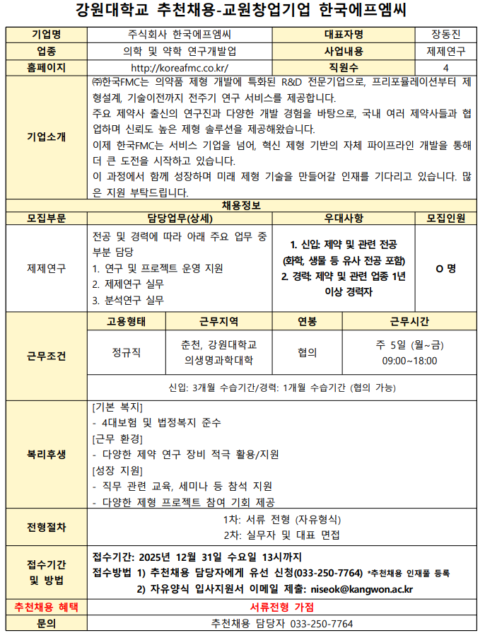 [공지] [취업] (주) 한국 FMC 추천채용 안내 (12/31 수요일 13시까지)