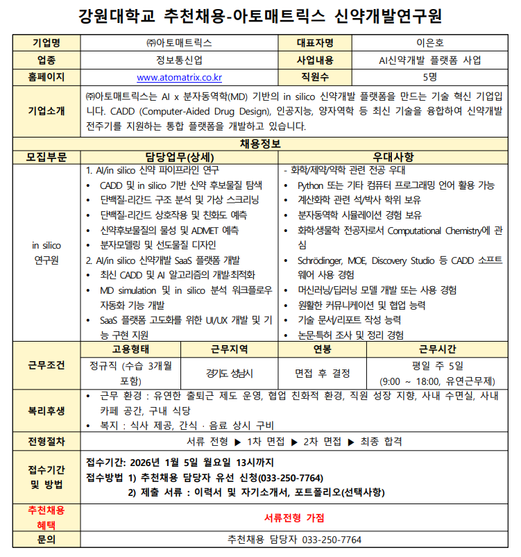 [공지] [취업] (주) 아토매트릭스 추천채용 안내 (2026/1/5 월요일 13시까지)