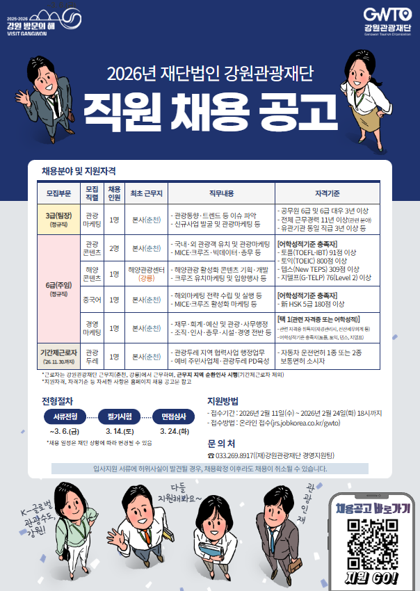 2026년 강원관광재단 신규직원 채용 공고 안내 (2/24 화요일 18시까지)